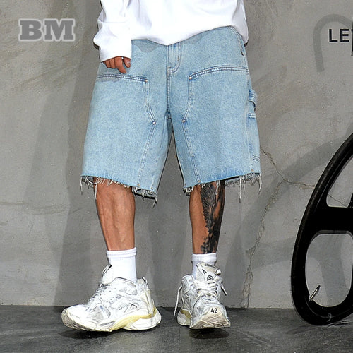 American Workwear Denim Shorts Men 5 Inch Blue Hip Hop Streetwear Summer Outdoor High Quality Raw Edge Vintage Heavyweight Jorts